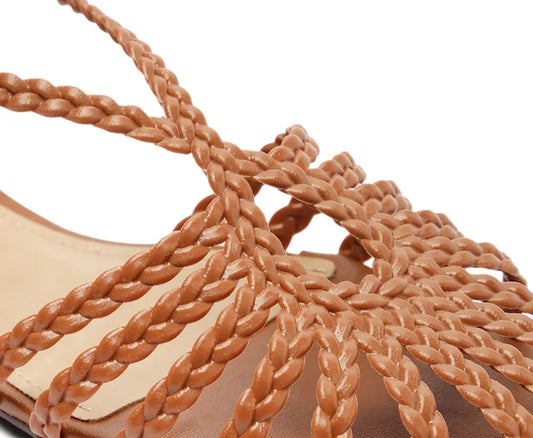 Flat sandal with braided straps, teardrop shape, brown.