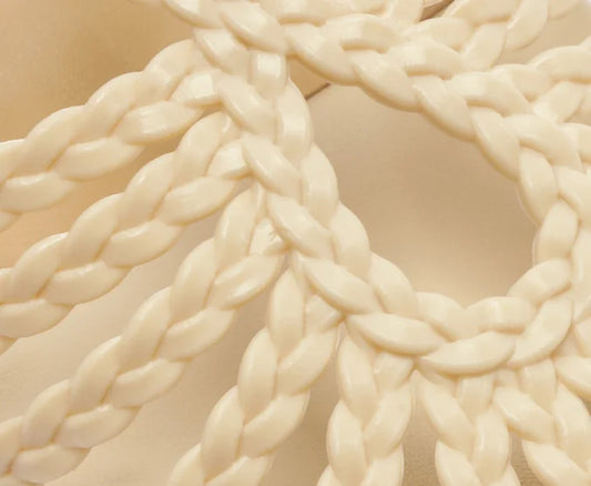 Flat sandal with braided straps, white teardrop shape.