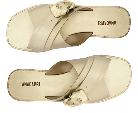 Flat sandal with crossed straps and gold buckle.